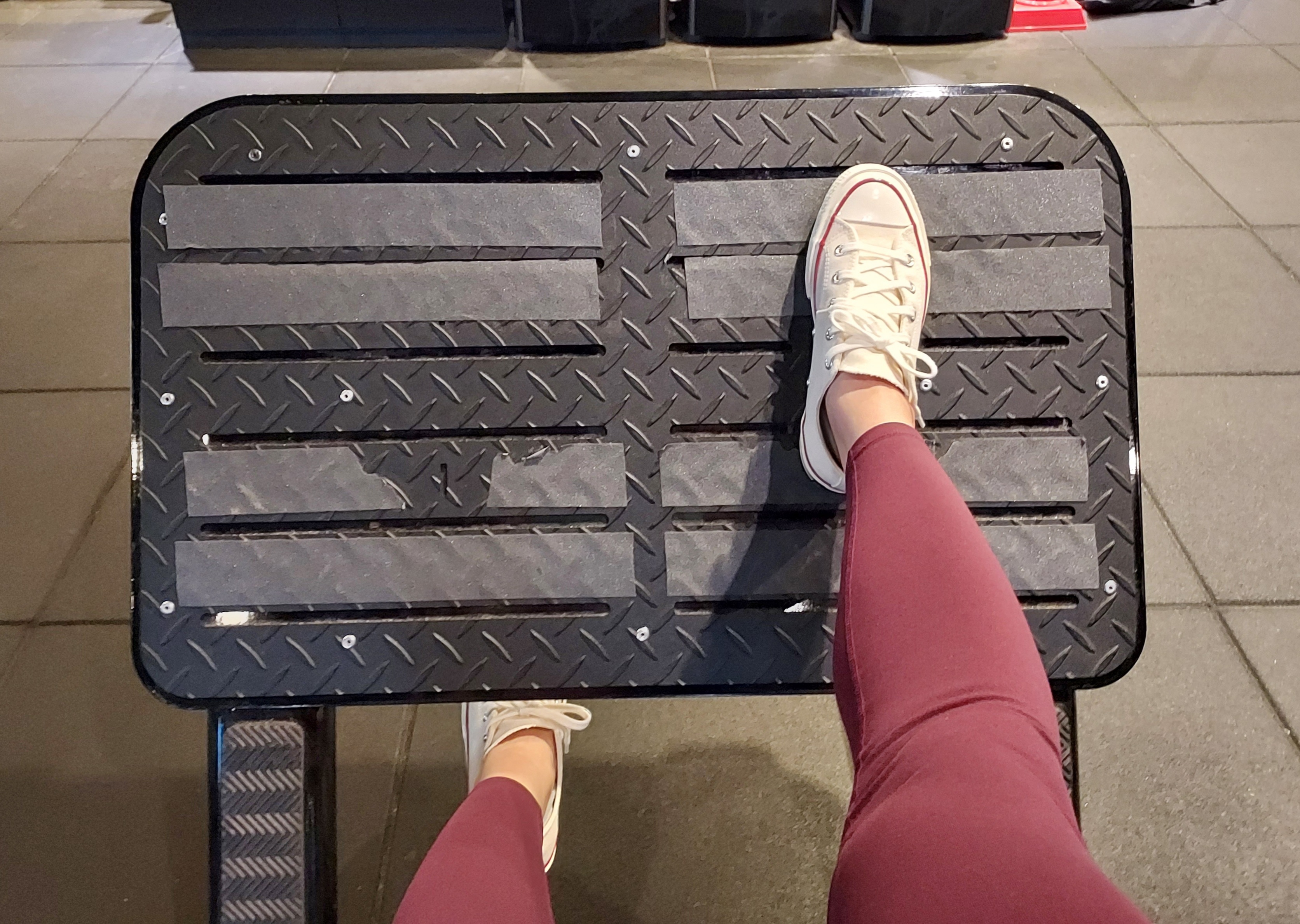 - 한 다리를 발판에 배치 시킵니다. 오른 다리를 운동한다고 하면 왼다리는 발판 아래로 넣어 지면으로 부터 띄웁니다.
