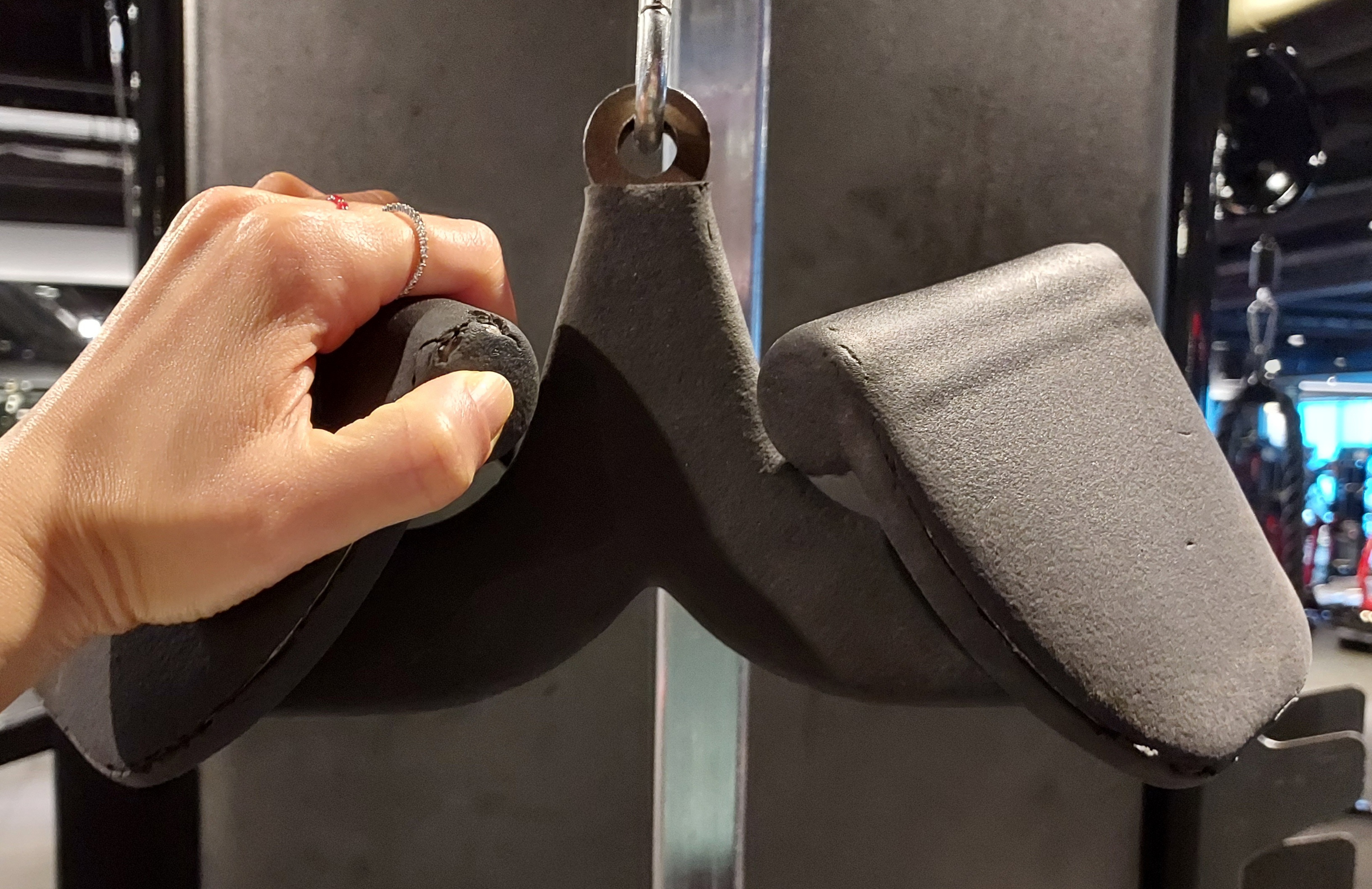 - 케이블 아래에 무릎을 꿇어 바닥에 앉아 줍니다. 바를 오버그립으로 잡습니다.