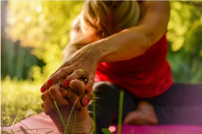 하늘을 보고 눕습니다. 한 발목을 잡아 바깥쪽으로 구부려서 스트레칭합니다.
