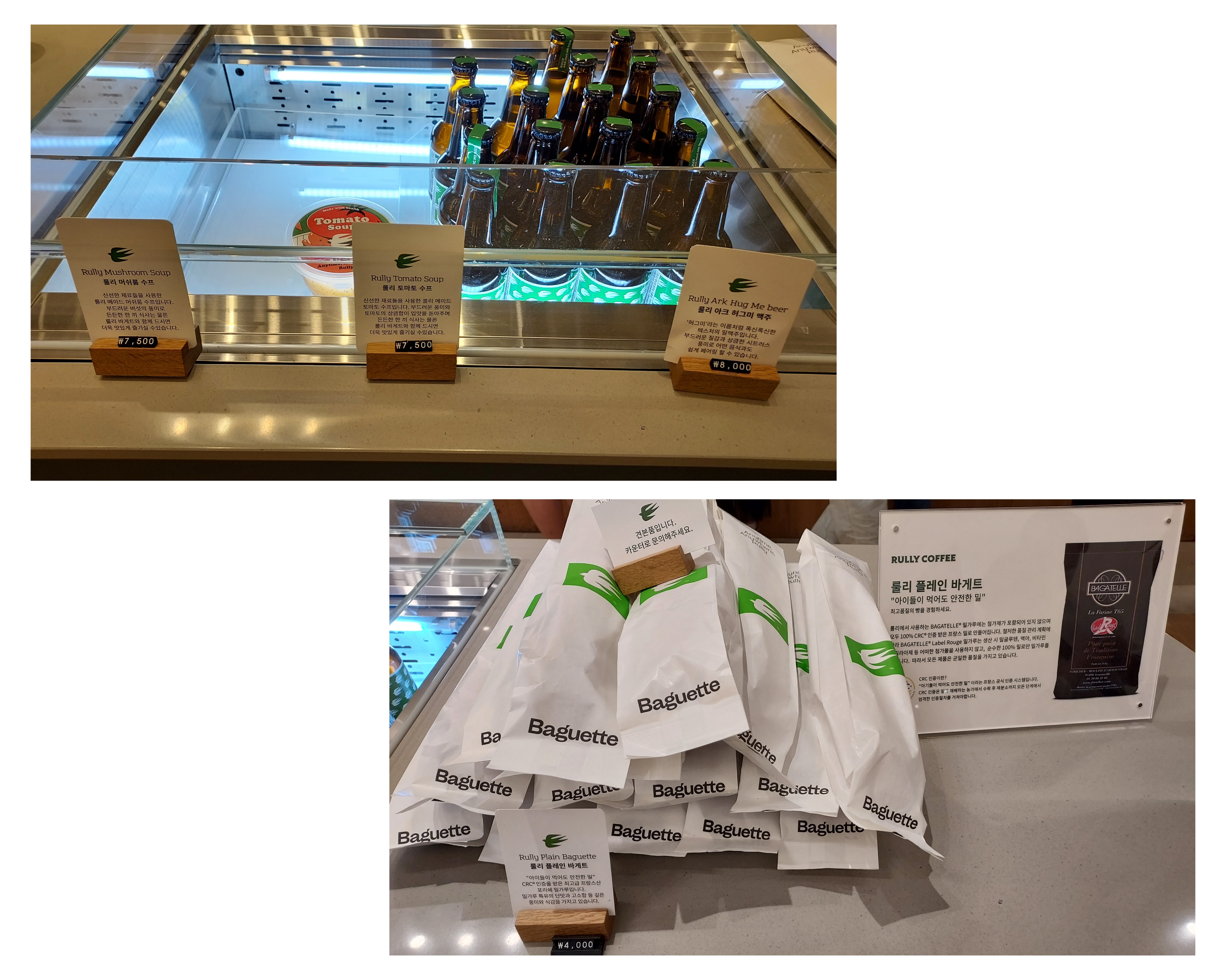 - 바게트, 그릭요거트, 크림치즈, 잠봉·팥·마늘 버터, 초코·녹차라떼, 자몽·레몬에이드,