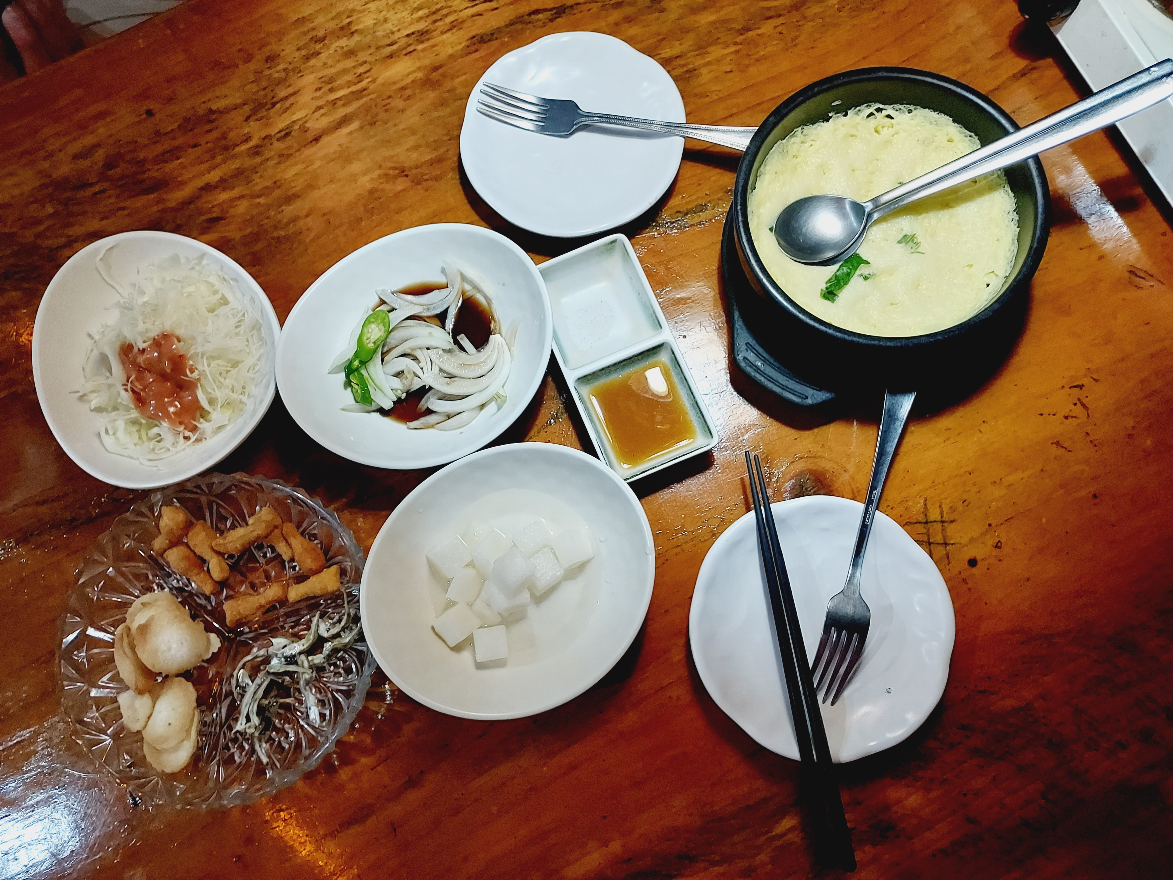 - 다양한 기본찬 ( 양배추샐러드, 양파절임, 과자, 멸치 등의 건강식)