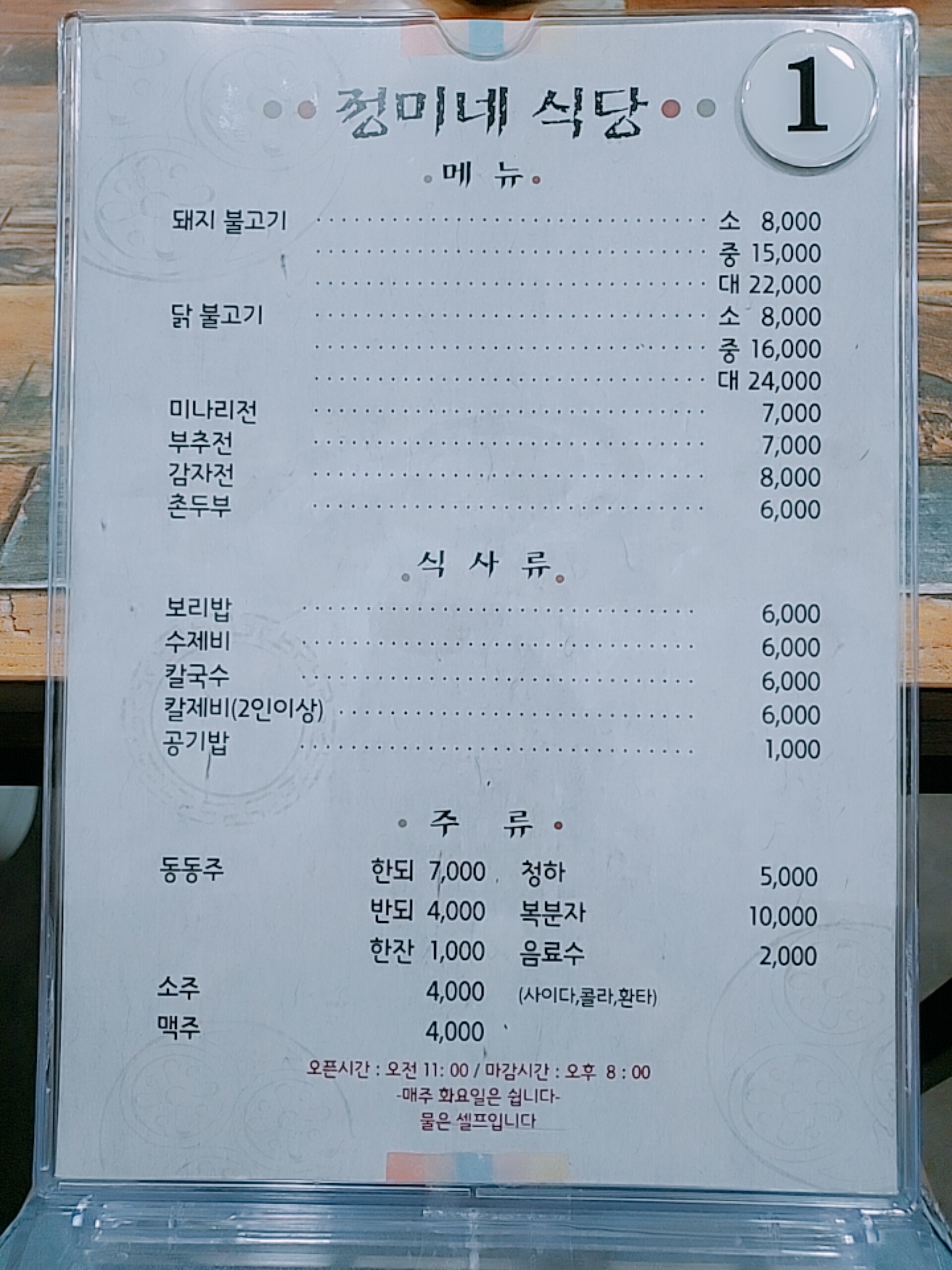 3 명가서 닭불고기 중자, 감자전, 두부, 동동주2잔 시키니 양이 맞았고 인당 1만 원 꼴이에요.