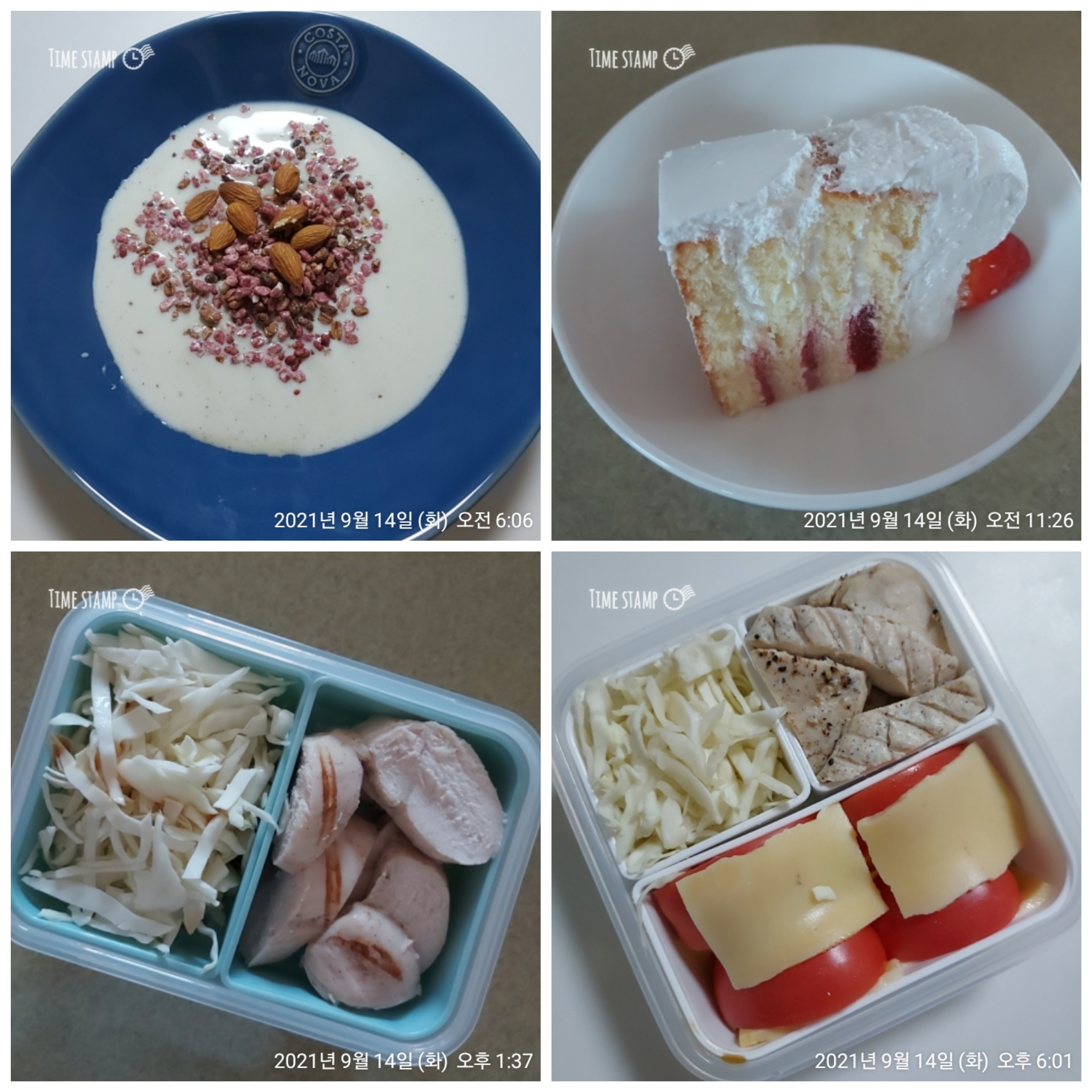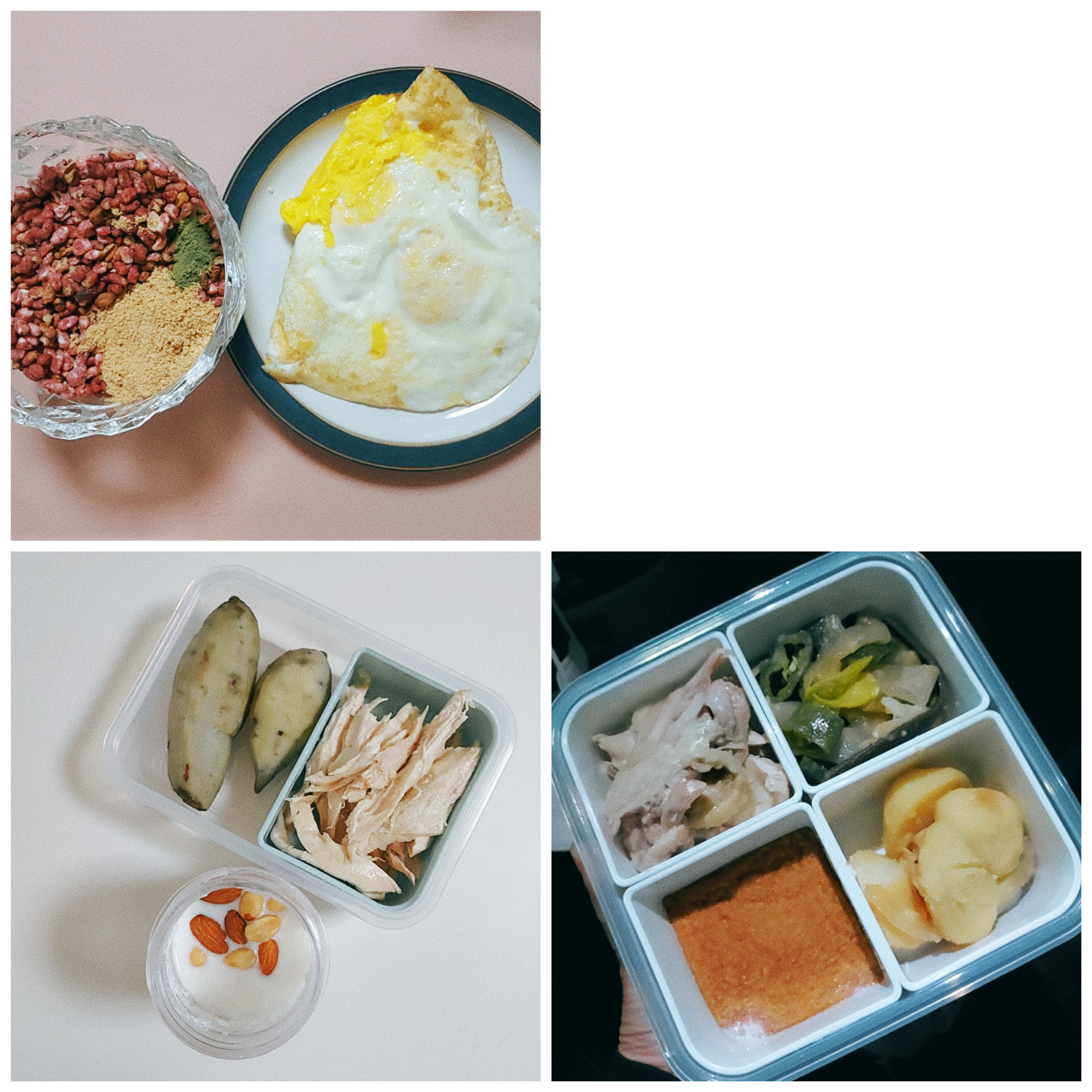 10시 고구마, 감자, 가슴살, 요거트, 아몬드, 우엉볶음